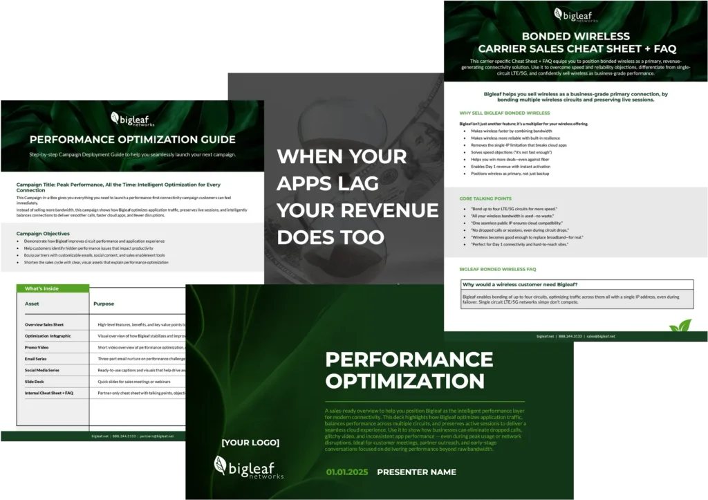 Bigleaf’s Performance Optimization Campaign-in-a-Box gives partners everything they need to shift the conversation from bandwidth to application experience — enabling revenue-focused conversations that drive real business outcomes, including: